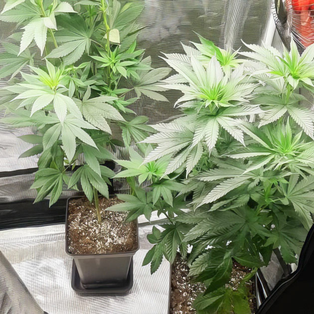 В начале шестой недели провёл топпинг, удалив макушки на обоих кустах. После обрезки дал по 400 мл воды с Bio Enhancer, концентрация 0,4 мл/л. Как только растихи пришли в себя от топпинга, заметил небольшую разницу фенотипов. Не могу сказать, что это плохо, так даже интереснее. Поливаю кусты раз в 2-3 дня, чтобы не залить, ориентируясь на просыхание почвы. Стабильность условий и умеренная подкормка дают о себе знать: кусты не стрессуют, выглядят здоровыми и постепенно развиваются.